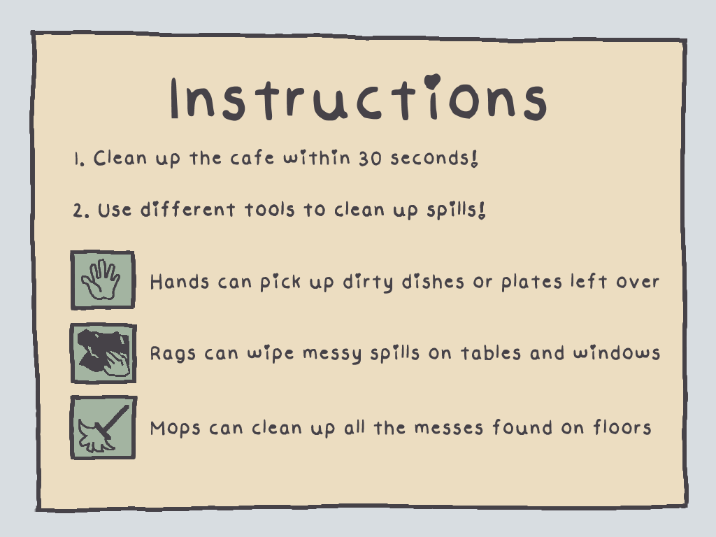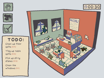 A short point and click game about cleaning up a cafe. Wipe down some tables, return dirty dishes, or choose to do nothing (as if they would fire you ... right?).